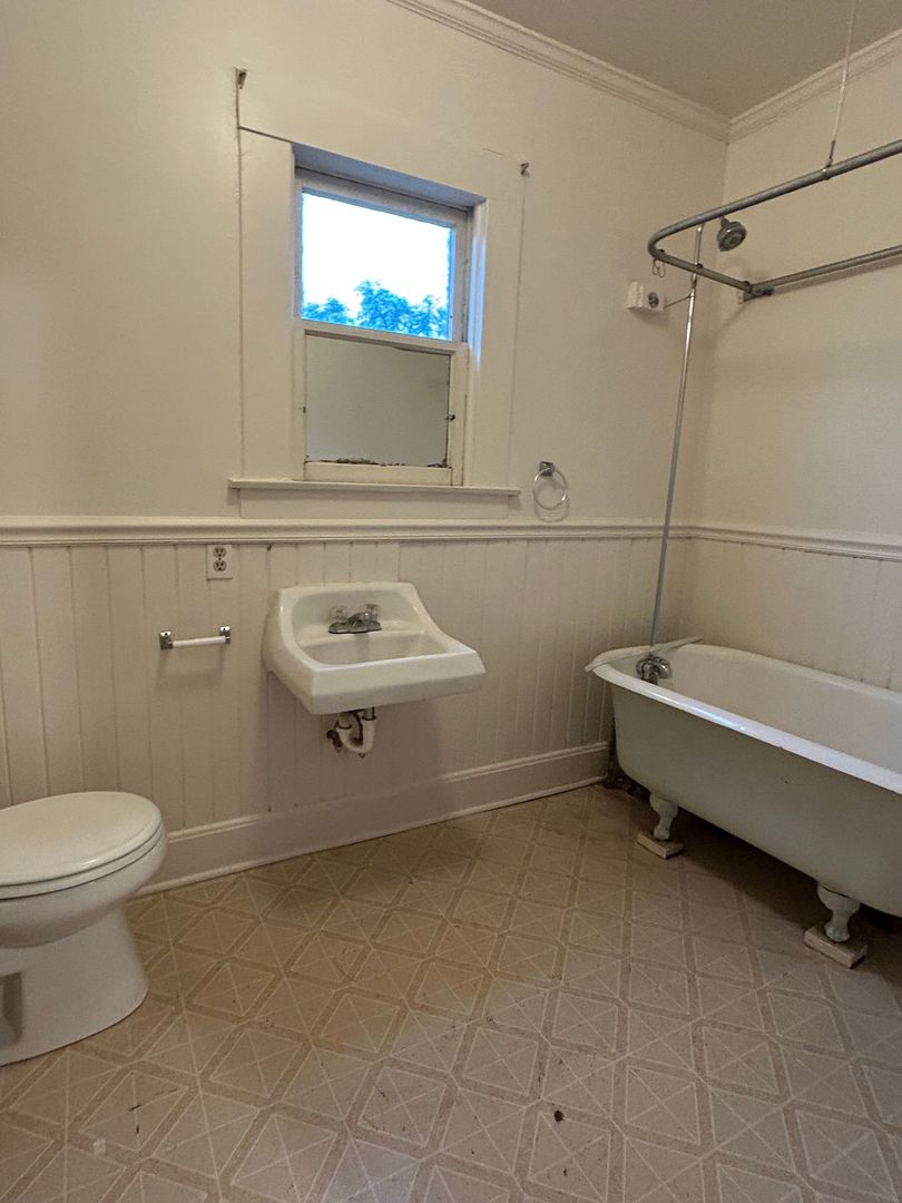 (Claw tub/shower) House with front porch. Large living room, basement, storage shed, fenced yard, nicely located
