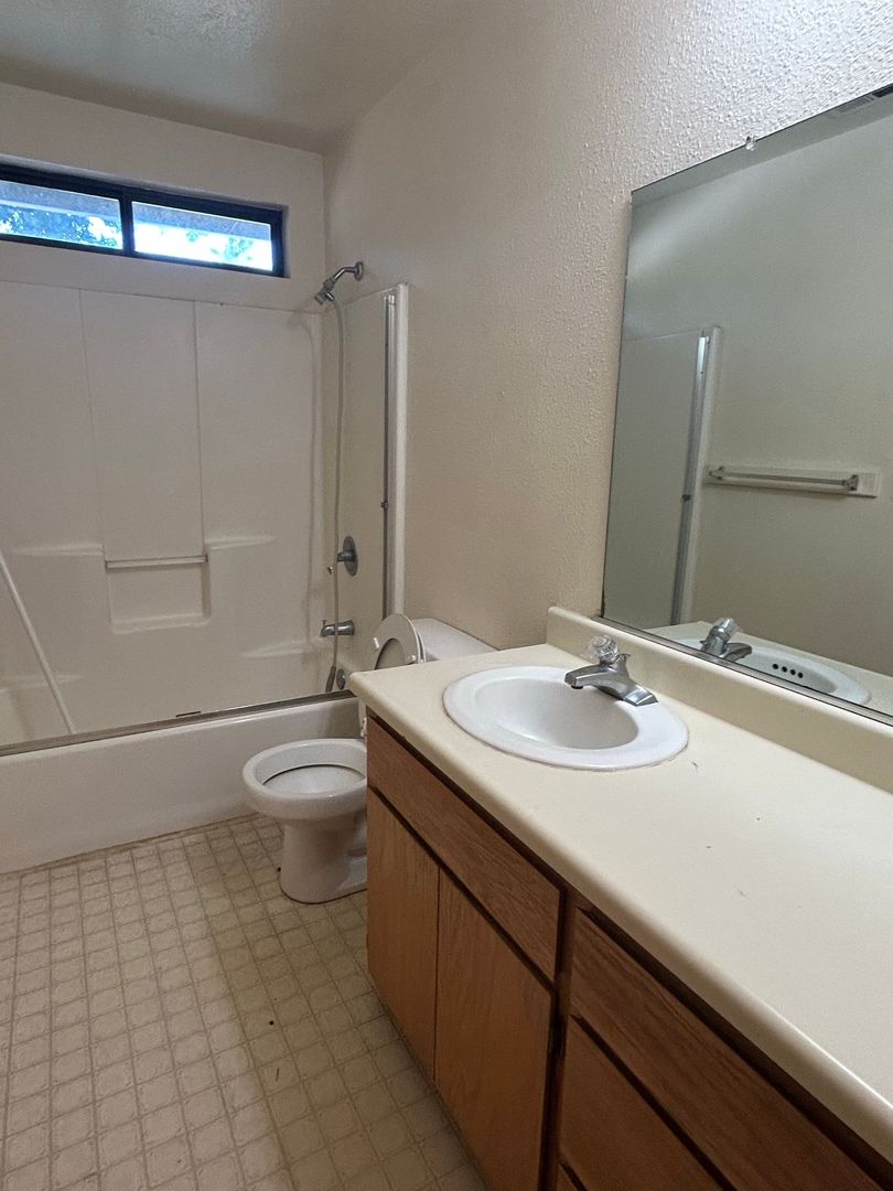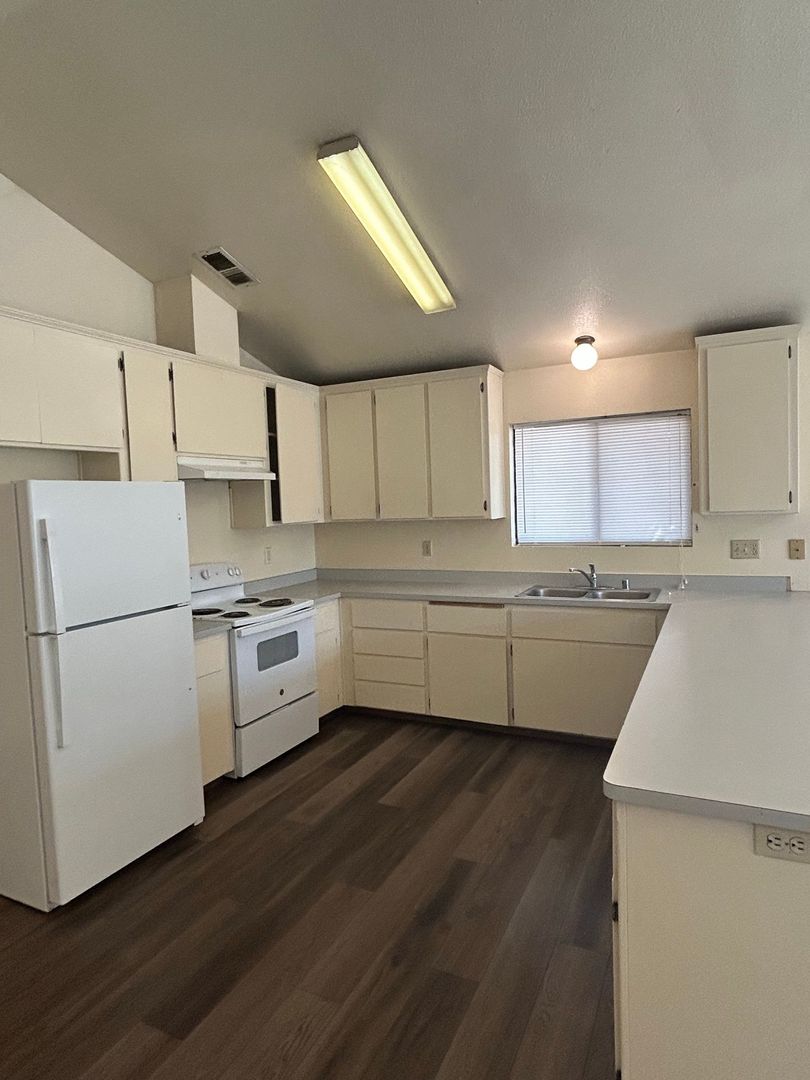 The kitchen is equipped with essential appliances, including a stove, fridge, garbage disposal, and dishwasher, making meal preparation a breeze.